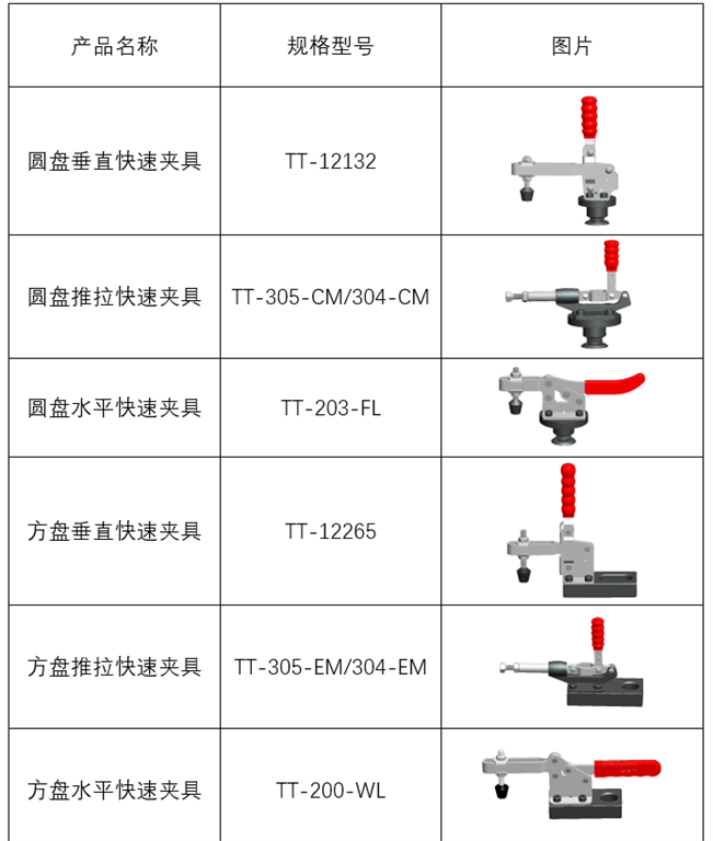 三維焊接快速夾具包含圓盤垂直快速夾具、圓盤推拉快速夾具、圓盤水平快速夾具、方盤垂直快速夾具、方盤推拉快速夾具、方盤水平快速夾具多種。